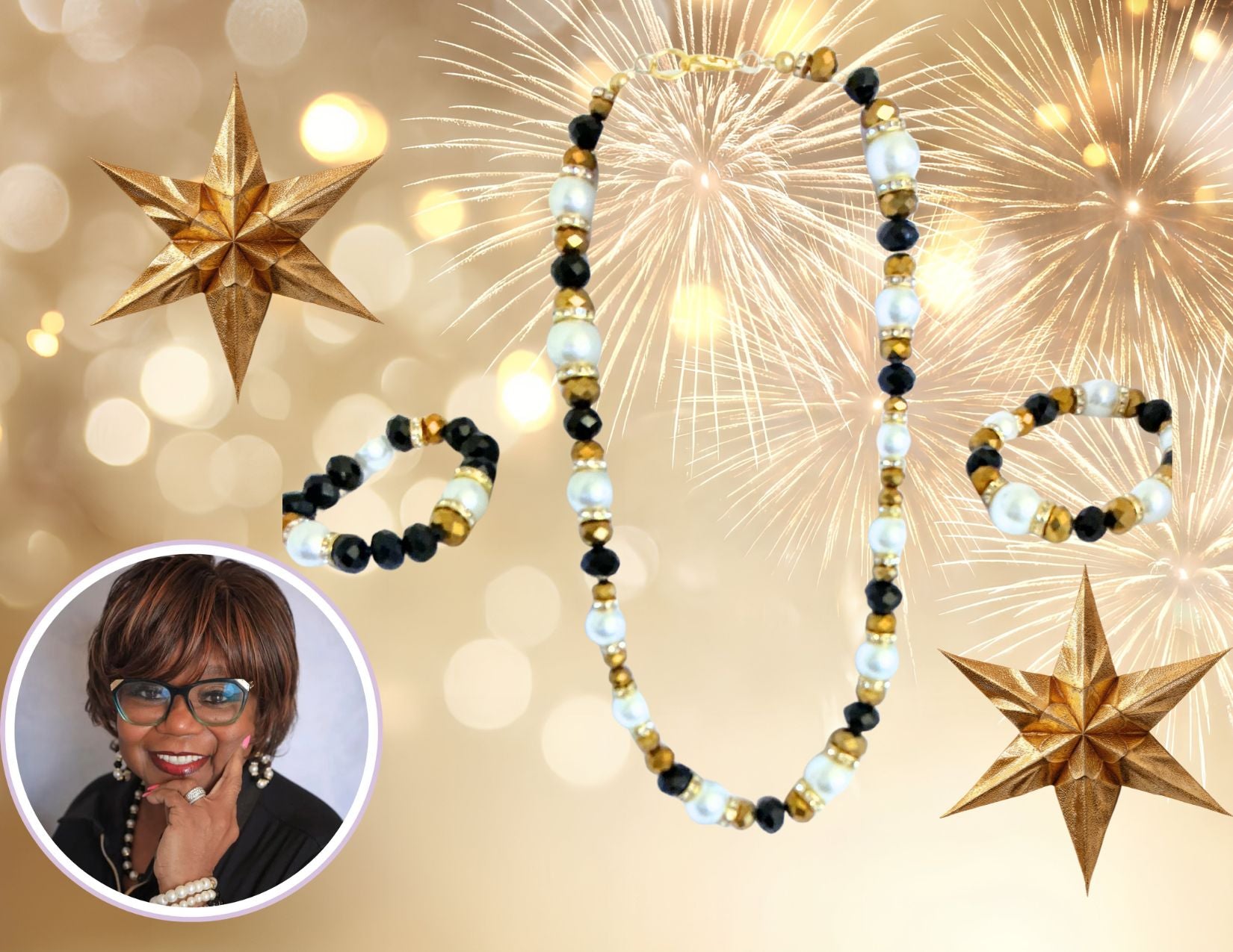 Classic. Confident. Timeless. This elegant set features a gold, white, and black beaded necklace paired with two coordinating bracelets. The perfect balance of bold contrast and refined shine, designed to elevate any outfit from everyday chic to evening elegance. Wear together for a powerful statement or mix and match for effortless style.